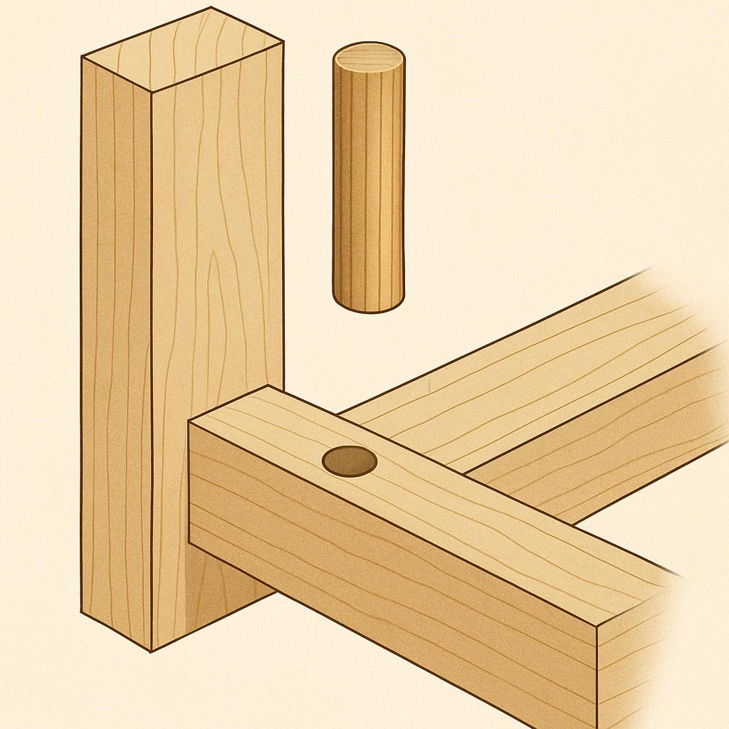 In a dowel joint, small round wooden pegs are inserted into matching holes in both boards. It’s a simpler alternative to mortise and tenon but still very strong.